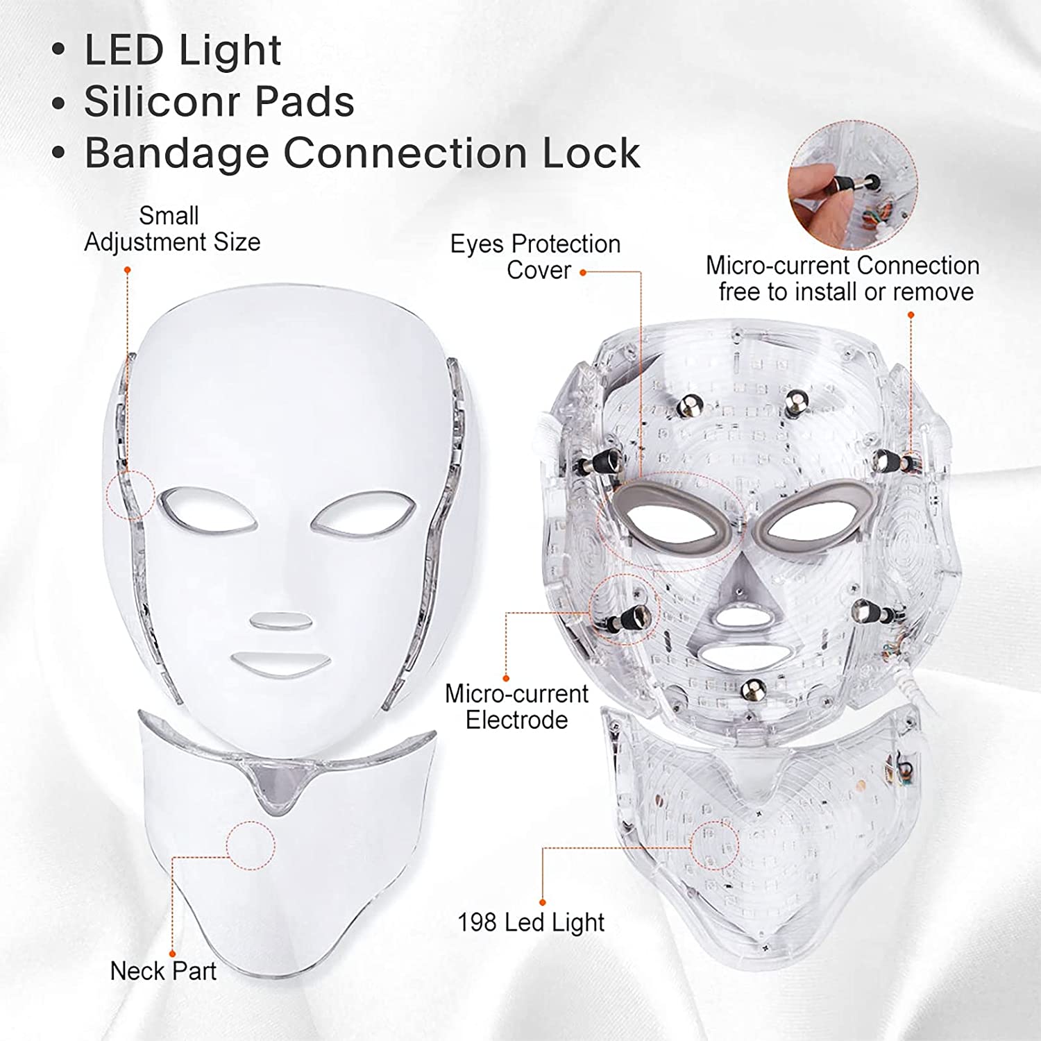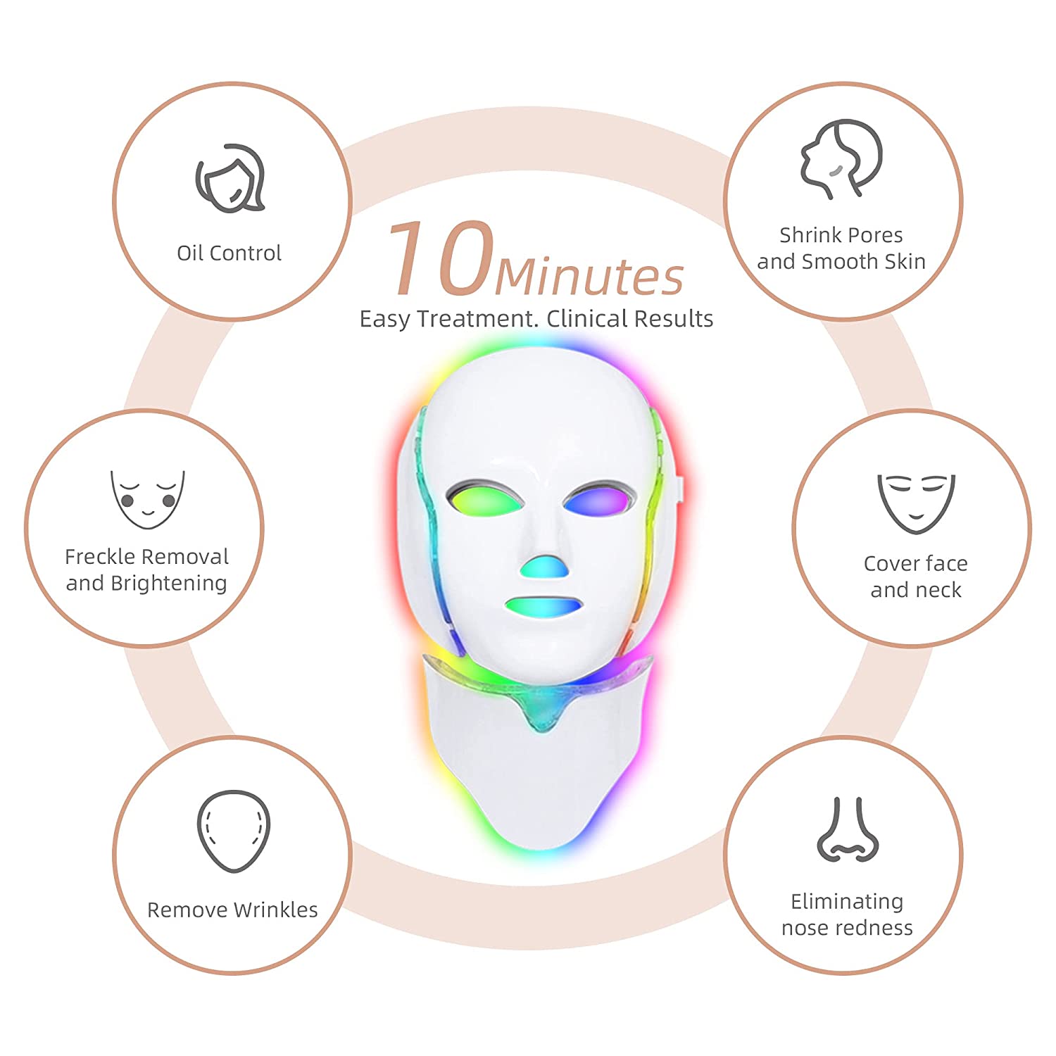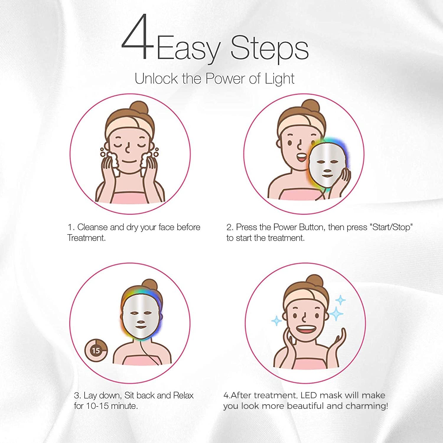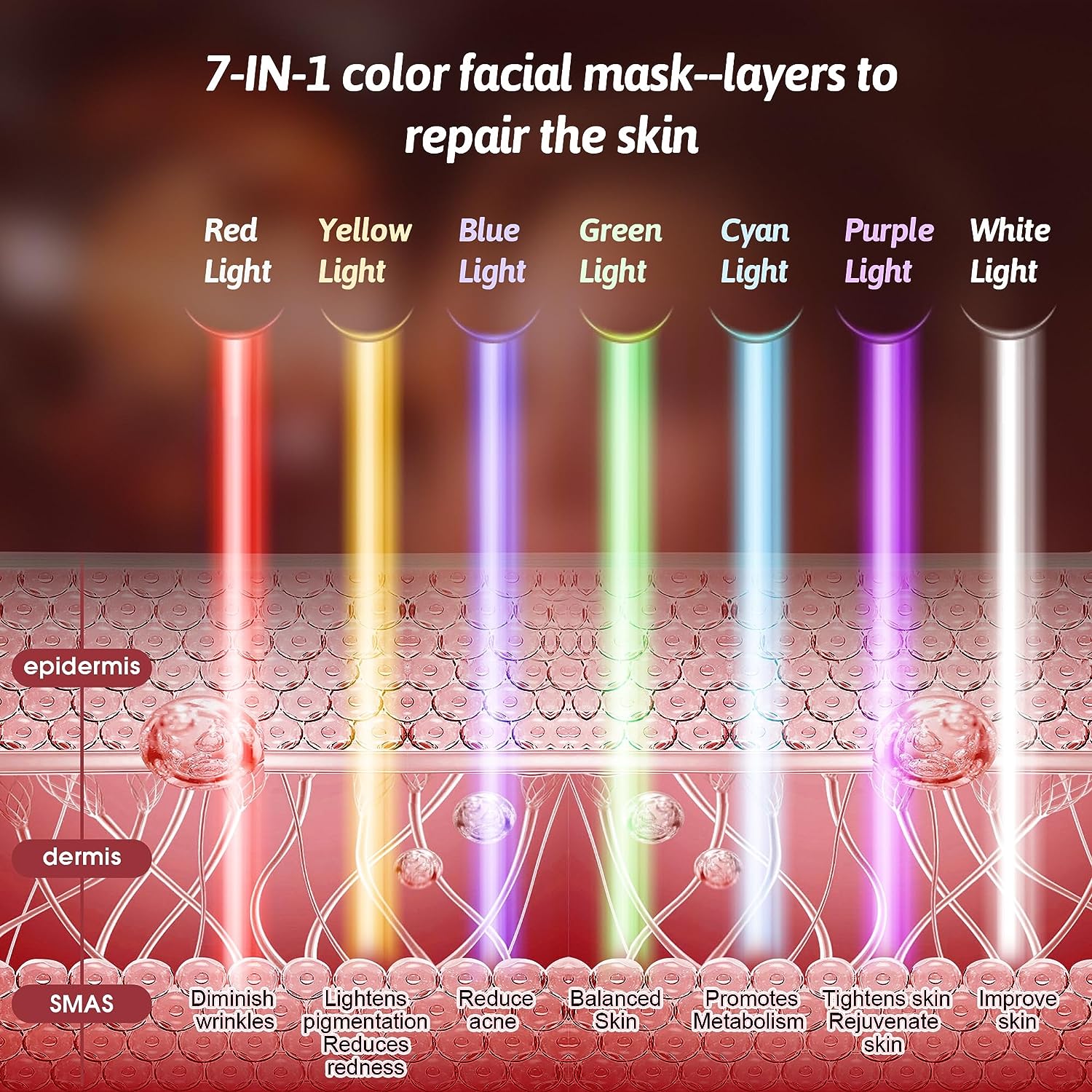 7 Color LED Mask: Red Light(630nm)-Increase Blood Circulation and Collagen Production, Whitening (effects for melasma); Blue Light(470nm)-Calms and Tightens Skin; Green Light(520nm)-Improve Pigmentation, inhibit The formation Of Melanin Pigment, Reduce Wrinkle and Fine Lines, Anti-Aging; Yellow Light(590nm)-Smooth Skin and Reduces Redness; Purple Light(390nm)-Relaxing, Improves Lymph Metabolism - Cyanine Light(415nm-520nm)-Soothing, Can Help Allergies; NEW White Light- Accelerate Tissue Metabol.